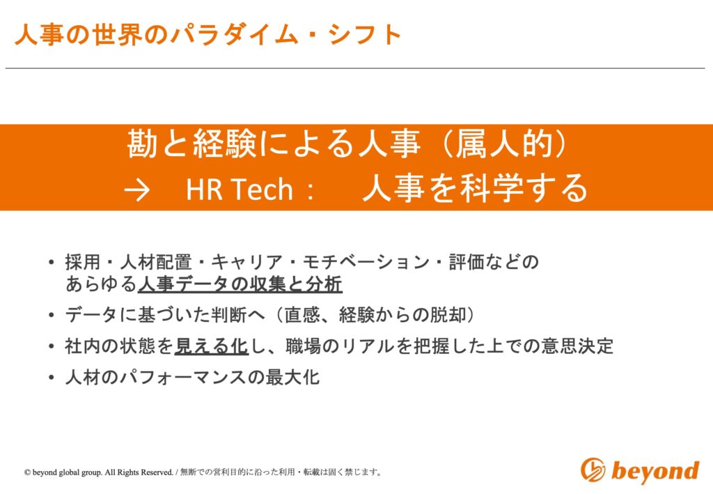 このような状況に対して、今、世界のグローバル企業が注目しているのが「HRテック」です。特に注目されているのは、組織と人材の状態を“見える化”し、定量的なデータをもとにマネジメントの意思決定を行う「科学的人事」の実現です。