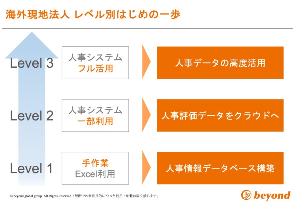 特に小規模な現地法人では、今もなお人事データが紙ベースやExcelで管理されているケースが多く見受けられます。このような状態を「レベル1」と位置づけ、そこから段階的に人事システムの導入(レベル2)、フル活用(レベル3)へと進化していくことが現実的なアプローチです。