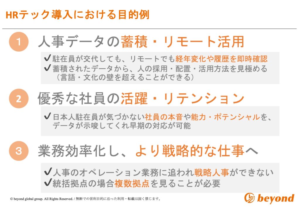 そうした現状に風穴を開ける鍵が、HRテックの活用です。決して大掛かりな改革である必要はありません。まずは自社の人材情報を整理し、見える化するところから。小さな一歩を積み重ねることで、現地拠点の“人を見る目”が変わり、現場の納得感が生まれ、組織が少しずつ変わっていきます。