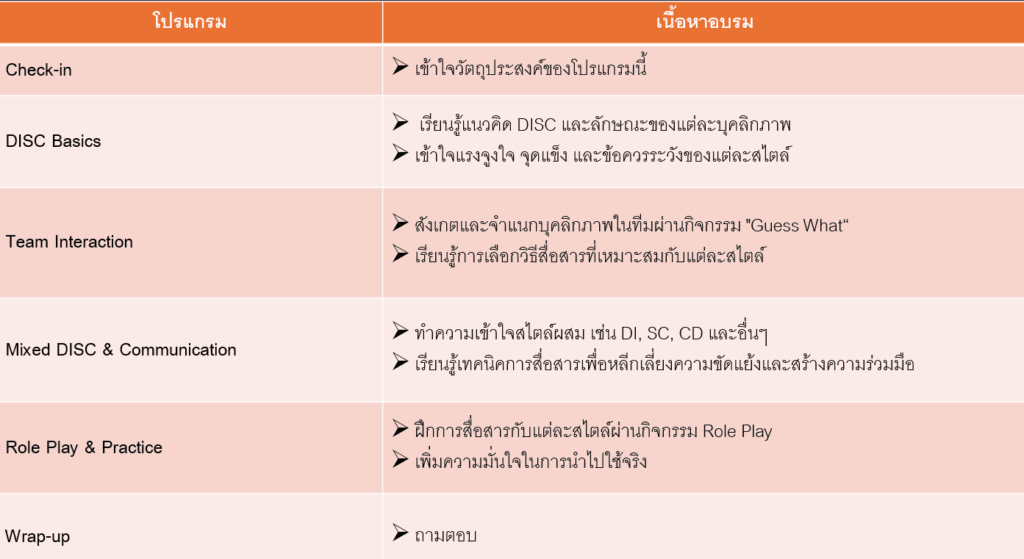 • เข้าใจลักษณะการกระทำของตัวเองและผู้อื่นผ่านทฤษฎี DiSC เพื่อสร้างฐานความเข้าใจซึ่งกันและกัน